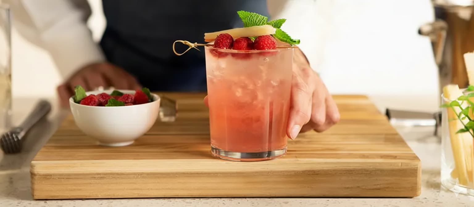- Garnish: 2 Contemporary Raspberry Cane Sticks and Mint Sprig