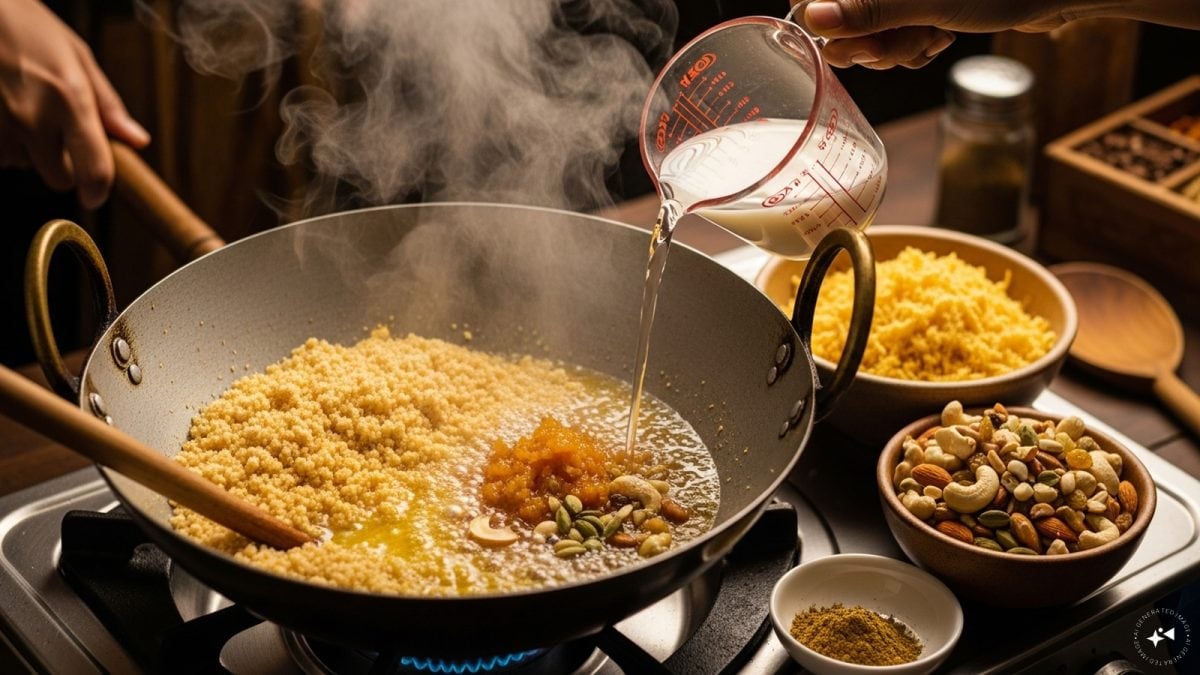 Components: 1 cup atta or suji, 1 cup grated jaggery, ½ cup ghee, 2.5 cups water or milk, chopped nuts (almond, cashews, raisins), ½ tablespoon cardamom powder. (Picture: AI Generated)